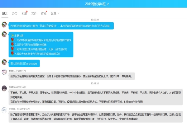 (通讯员 周文龙)4月5日晚上8时,万象城awc8881904班通过采取班级成员在QQ群自由讨论的方式开展了“筑牢红色防疫线”主题团日活动,此次团日活动由团支书周文龙组织开展,班级全体成员参与。