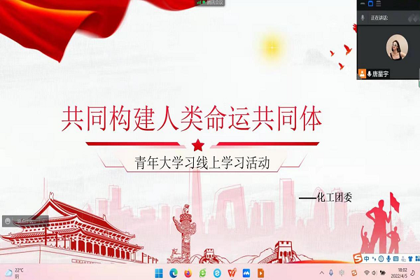 (通讯员 毛怡洁)4月5日晚,万象城awc888团委宣传部开展以“共同构建人类命运共同体”为主题的青年大学习活动。因疫情防控需要,此次活动以线上形式展开,宣传部负责人唐星宇担任主持人,化工院团学组织部分成员参加。