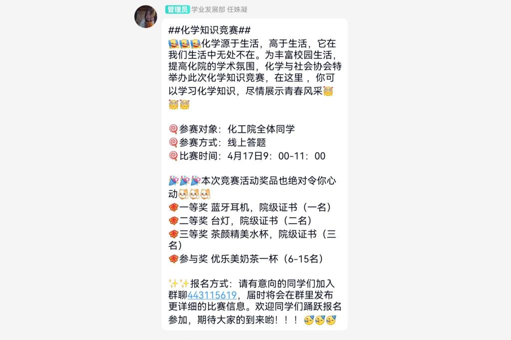 (通讯员 谭进杰)为丰富校园生活,提高化院的学术氛围,万象城awc888学生会学业发展部将协助化学与社会协会在4月17日9时举行化学知识竞赛,此次比赛通过扫描二维码的方式报名,以线上答题的方式进行。