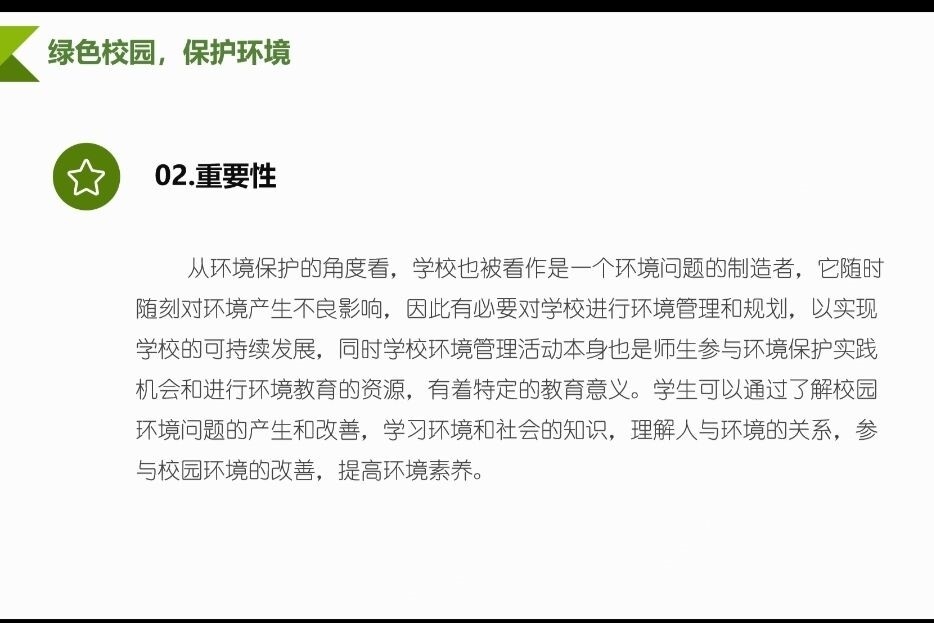 此次活动因疫情原因于线上召开,本次活动中分别从“什么是绿色校园”、“为什么建设绿色校园”、“大学生如何建设”三个方面进行阐述。在此过程中,深刻的了解到建设绿色校园的重要性与必要性。届时,从五个方面建议同学们该如何去建设我们的绿色校园。