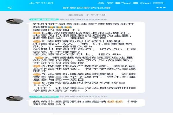 此次志愿者活动以线上形式展开,内容为以新冠肺炎疫情为主题,征集图片、海报、文章。在此次志愿者活动中,2101班全体同学积极参与,从日常生活中寻找与疫情有关的点点滴滴。4月19日21时0分,2101班同学将拍摄的照片及写的文章交给朱羿晓汇总,活动结束。