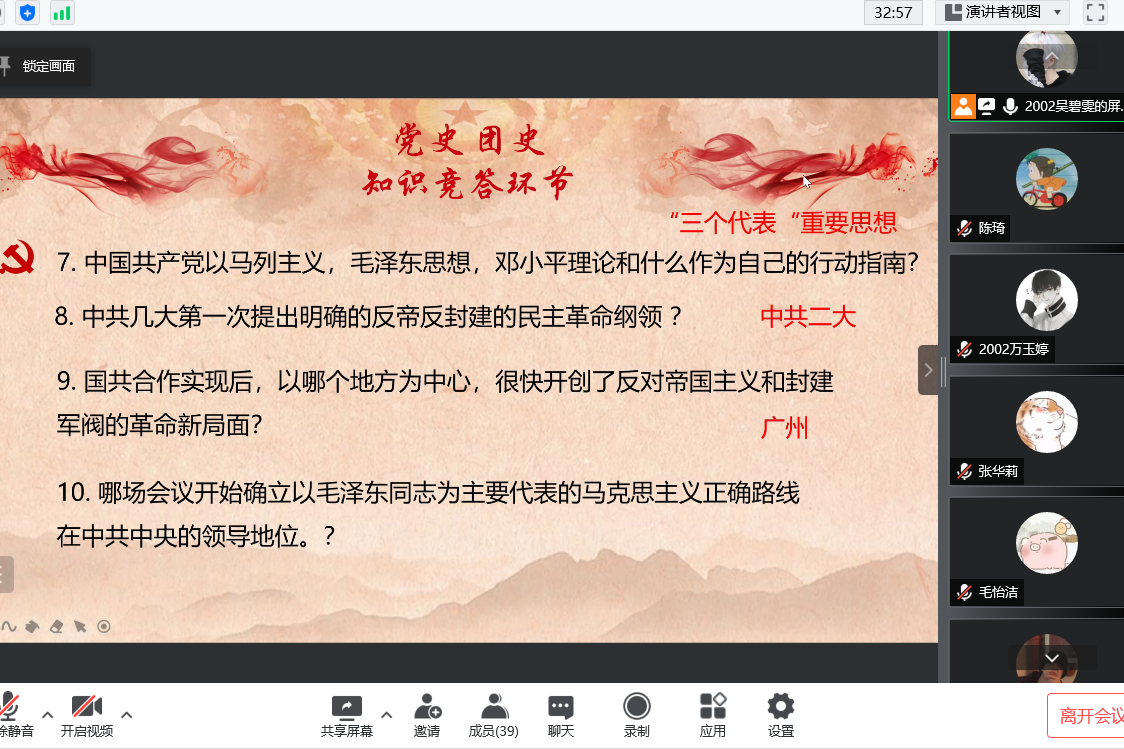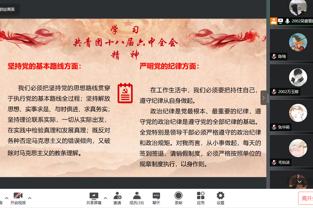(通讯员 陈琦)2022年4月30日19时00分,万象城awc8882002班借助腾讯会议平台开展了线上春季理论创新活动。