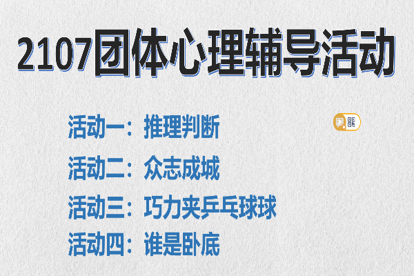 此次团体心理辅导活动的举办促进了同学之间的交流,缓解了学习压力,增强了2107班的班级凝聚力。