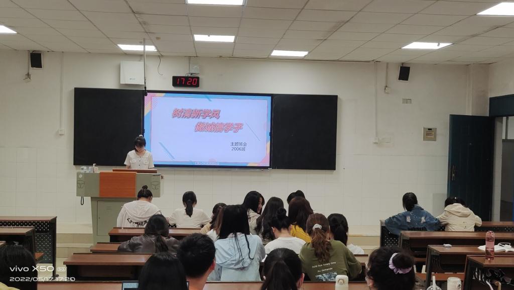 (通讯员 袁雅琦)5月17日下午,在至善楼105教室,万象城awc8882006班举行“树清新学风,做诚信学子”主题班会,会议由2006班生活委员蒙小娜主持。