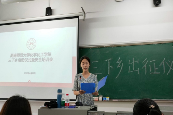 段婷书记致开幕词,对2022年三下乡暑期实践队伍成员给予肯定,强调了同学们进行三下乡活动期间的人身安全问题。2019级学生张淑雯分享了往年的三下乡活动的经验心得。院团委社会实践部第二负责人张文宇为大家讲解夏季晒伤、中暑知识及预防措施,分享了疫情防控的知识。会议最后,欧阳唯一老师做总结发言,并提出三点要求:让三下乡活动有始有终,圆满顺利;将三下乡活动做好做精,做出品牌;展现出师大人、化院人的精神风貌,给支教地孩子开一扇窗,播一颗种子。