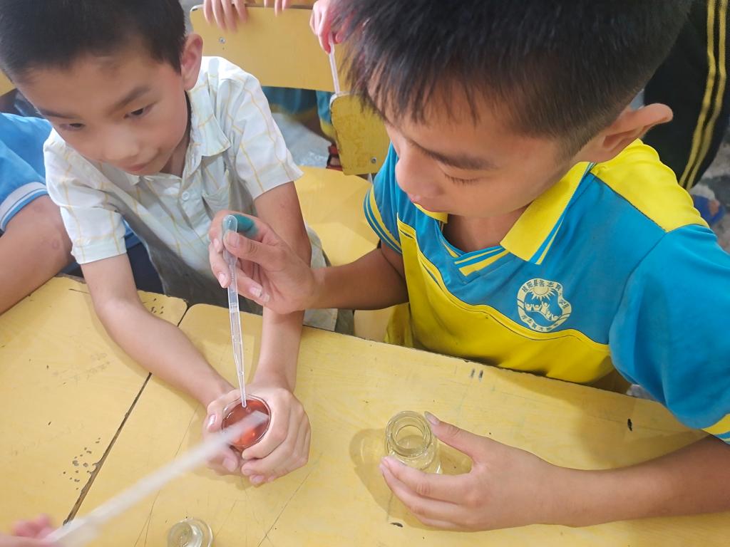 此次趣味化学实验的内容为高锰酸钾与柠檬酸钠反应变色实验,以及小苏打与醋酸的泡沫喷泉实验。在主讲教师的基本原理讲解和助教的步骤演示后,为学生提供了所需的药品及器材,保证每个学生都能参与动手实验。目的是为了丰富桂阳县苦志育才学校学生的课后知识,让学生了解一定的化学基础知识,提升学生的动手能力。活动中同学们积极参与互动,回答问题,小组内讨论合作完成趣味实验。