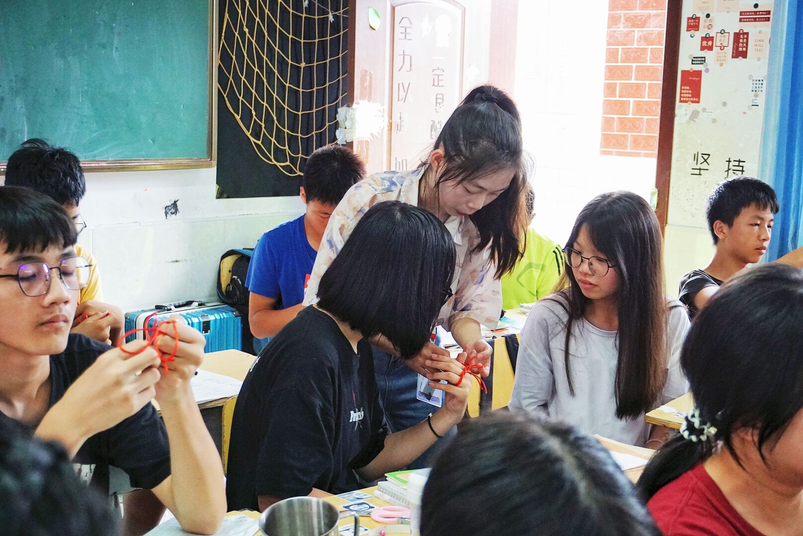 (通讯员 韦彩琳)7月2日13时50分万象城awc888“蒲公英——把知识带去乡村”队在衡阳市祁东县启航学校初中教学楼4楼八年级30班开展“美工中国结”特色课程活动,由初中教学组成员陈琦主讲。