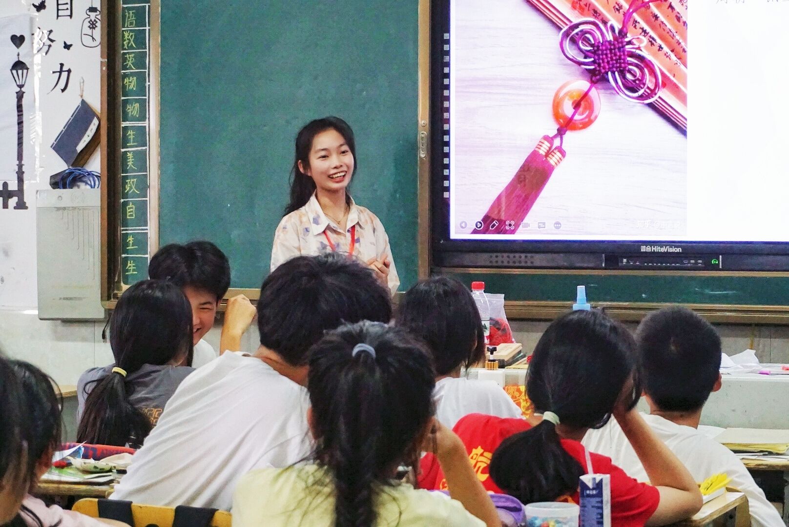 课程从中国结的由来引入,再具体带领学生们去感受不同种类中国结的魅力,最后由学生们来亲自动手实践。课堂上30班学生表现出对中国结的喜爱、对课堂的积极回应,使课堂氛围轻松有趣。学生们甚至想把他们下一节自习课继续用来上中国结编织。