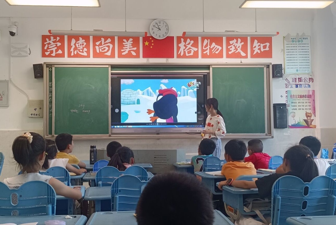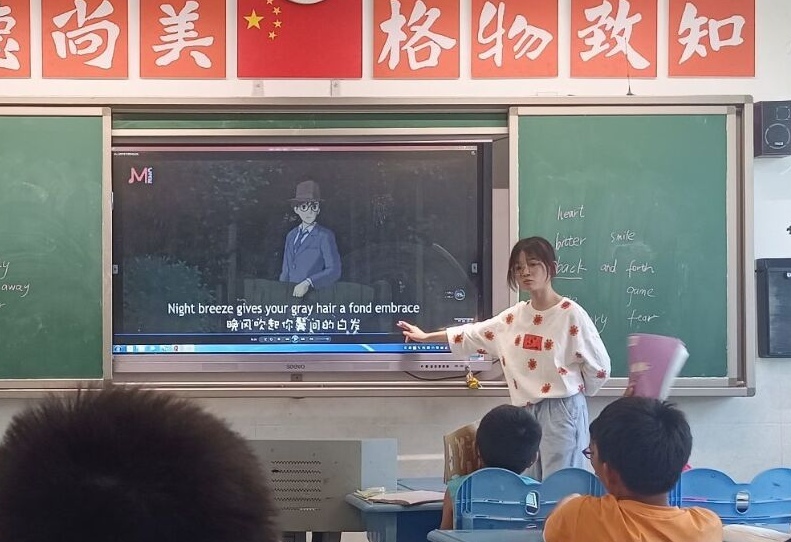 胡晶晶通过为学生们放映英语歌曲的教学视频作为课堂导入,激发学生的上课积极性。胡晶晶采用英语和音乐相结合的方法,给同学们讲解歌词中的陌生单词,并带领同学们朗读翻译歌词,学生们积极参与课堂并主动回答问题。在课程末尾学生们跟着教学视频学唱英文歌,对新学的单词进行巩固和应用。