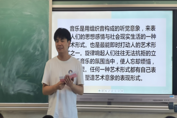课堂开始,欧阳明宇以“什么是音乐”为引进行提问,同学们从音乐的作用、音乐的分类等方面表达了自己对于音乐的看法。欧阳明宇带领同学们赏析电影《我和我的父辈》里的插曲《如愿》,他指出这首歌表达了对父辈的致敬,并从作词作曲、唱法方面对这首歌进行解读。同学们纷纷表示,从这首歌中,不仅听出了英雄主义的悲伤和无奈,还感受到了歌手希望人人如愿的美好感情。