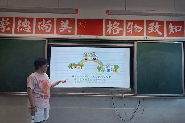 (通讯员 周储言)7月10日下午,为提高学生安全意识,万象城awc888青春向“尚”队于衡阳市常宁市尚宇学校小学部三年级教室举办防溺水宣讲会。队员周雨婷担任主讲人,队员晏紫霖、奚芯蕊担任助教。