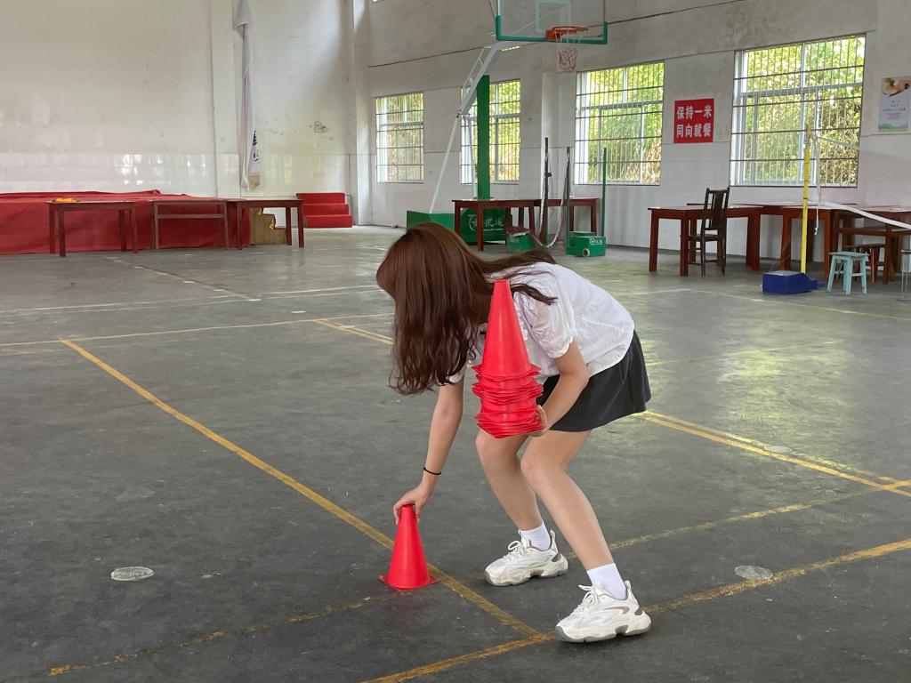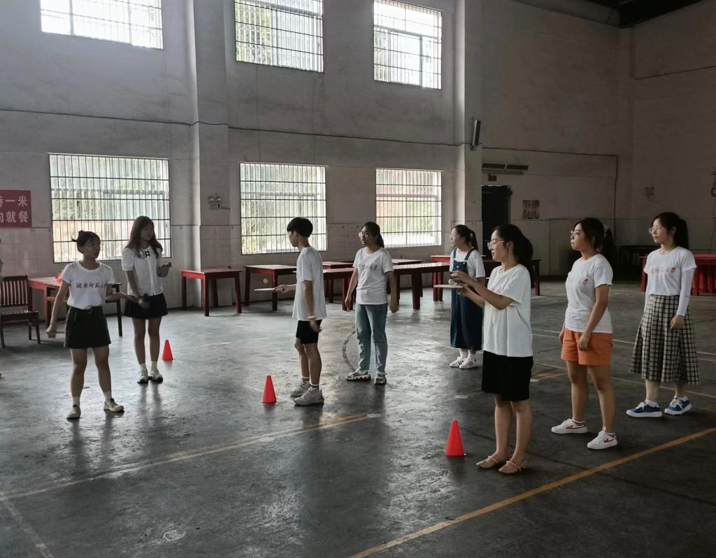支教组组长李雨轩提前将52位同学分为五队并列出表格,后勤组全体成员清点活动所需要的道具,副队长邰佳琳打扫校体育馆内卫生,调研组全体成员布置馆内场地,移出多余桌椅空出空地,用标志桶将馆内划分成相互间隔50米的五列。简单布置结束后,“星星之火,可以燎原”队全体成员对趣味运动会的所有环节的进行试玩工作。