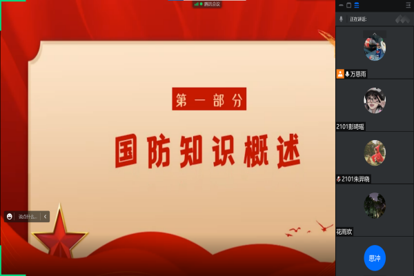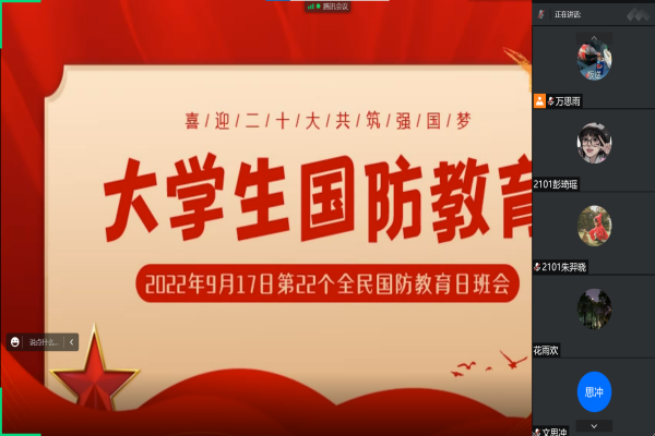 (通讯员 黄蕾)2022年9月17日19时,万象城awc8882101班全体成员在腾讯会议上举办以“国防教育”为主题的线上团日活动。此次活动由团支书万思雨主持,2101班全体成员参加。