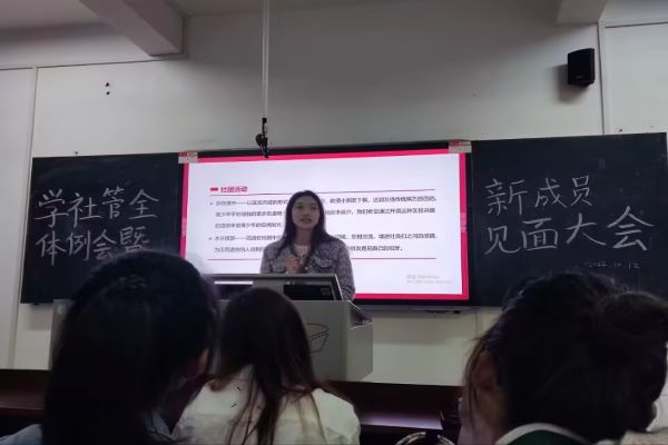 会议中,各位新老成员依次进行了自我介绍,自我介绍过程中,成员们分享兴趣爱好,表达对未来工作的期望。为使新成员了解各部门工作任务,学社管各部门负责人对其部门的主要职责及近期任务进行了简单介绍,各社团理事长也对其社团活动展开讲解,并汇报近期活动。学社管指导老师谢云霞对此次例会进行了简要总结,并在讲话中表达了对学社管各位成员们的殷切期望,希望全体成员能在学社管中锻炼、提升自我,成为更好的自己。