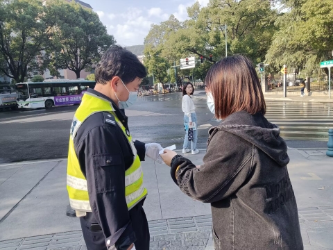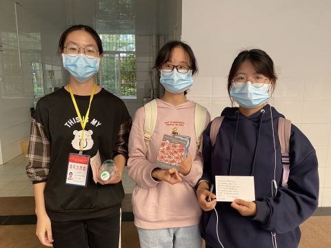 参与此次志愿活动的同学在至善楼102教室集合,在明信片上写下暖心话语后,以小组为单位前往二里半校区发放明信片,向警察、快递小哥、老师以及校园里的学生们传递温暖。在活动期间,同学们积极参与,并拍照留作纪念。