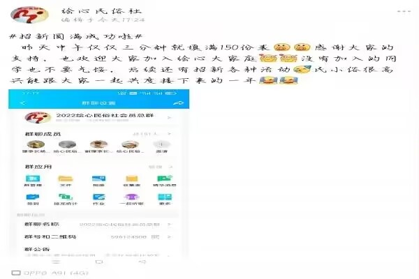 理事长杨依然与副理事长谭杰文于活动开始前召集理事安排相关准备工作。理事们在招新开始前积极解答招新群里的困惑,告知报名方式,并在招新进行时及时发送链接入口。招新活动结束后,理事会成员核对会员相关信息,确保问卷中无恶意占名额现象,并及时提醒成员若有信息填错应及时上报,如新老会员一栏是否填写有误。确定最终名单后,理事会成员按分配任务确保所有会员都进入了会员群。活动结束后,官方君发布说说庆祝招新完成,表达了对进入绘心的会员们的欢迎,同时也鼓励了没有能够加入绘心的成员,期待他们之后的参与。