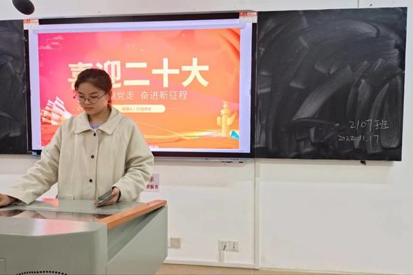 活动伊始,2107班团支书陈秋吉向大家介绍了此次活动的主题,而后分别从二十大的意义,二十大对青年的影响,两个方面分别进行详细介绍。期间对班级同学进行二十大相关知识点的提问,同学们积极参与。最后,陈秋吉对本次的团日活动进行了总结。