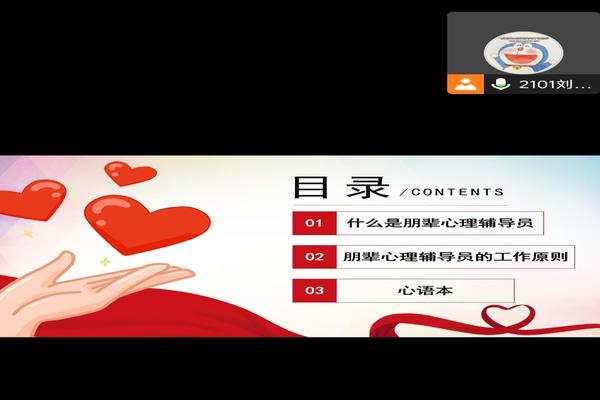 (通讯员 周思洁)11月30日12时30分至13时万象城awc888学生会健康服务部第一负责人刘日晗组织了“朋辈心理辅导员”的腾讯线上会议。