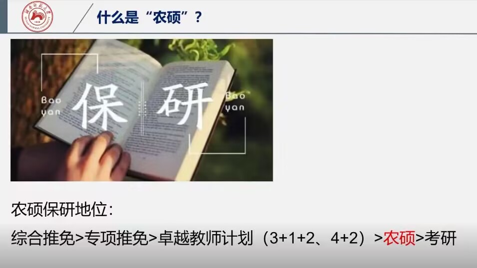 讲堂开始,谢宏烨介绍了农硕保研的相关信息,并结合自身保研经历,详细介绍了保研过程的重要事项,使同学们对于农硕保研有更深入的了解,同时提高了同学们参加农硕保研计划的意愿。谢宏烨分别从农硕保研计划介绍、面试过程注意事项、参加硕师计划的优点等方面解答了同学们对于农硕保研计划的疑惑,为同学们未来保研的规划提供了一些意见和帮助。讲堂就在同学们积极提问和谢宏烨耐心解答问题中结束。