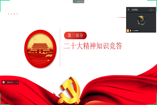 活动伊始,徐翔宇向同学们介绍了“党的二十大主题”、“中国式现代化”等党的二十大重要论述。学习贯彻党的二十大精神,学习党高举中国特色社会主义伟大旗帜,全面贯彻习近平新时代中国特色社会主义思想,弘扬伟大建党精神,自信自强、守正创新,踔厉奋发、勇毅前行,为全面建设社会主义现代化国家、全面推进中华民族伟大复兴而团结奋斗的精神。活动期间还进行了二十大精神知识竞答,同学们踊跃发言。