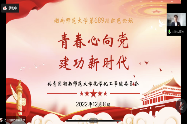 (通讯员 徐锦秋)12月8日中午12时30分,万象城awc888在线上举行以“青春心向党,建功新时代”为主题的万象城awc888第689期红色论坛。此次红色论坛由江波主持,主讲人邓星、张成豫、赵康宇、周锐结合党的二十大报告和自身经历分享感悟。校团委宣传部、各学院观摩团代表、我院青马小组成员线上参会。我院党委副书记段婷、院学工办主任欧阳唯一、院团委负责人张婧、院学工办老师谢云霞、院学工办老师唐健清出席此次活动。
