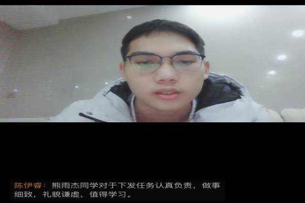 会议伊始,陈伊睿简要介绍了会议的主要内容,各团员发言顺序以及会议的相关纪律等有关事宜。会议开始后各位团员依次根据自己在2022年的表现和发挥团员作用的情况等发表个人总结陈述。其余同学在聊天框内对发言人进行评价,指出不足并提出建议。会议结束后以2105团支部为单位在班级群内对所有团员进行民主测评投票,支部委员会再以测评结果为基础,结合个人表现评选出优秀团员名单,并以此激励所有同学再接再厉。
