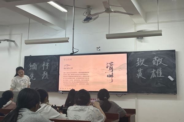 活动开始团支书简要概括此次活动举行的三个部分。介绍传统节日清明节的由来和习俗后,邀请几位同学朗诵有关清明节的古诗,感受独特的清明文化氛围。接着以图片和文字相结合的方式展示人民英雄纪念碑和红军长征纪念碑碑园,讲述革命先烈和英模的故事,再就中印边境之争展开详细讲述,让同学们再次温读有关中印边境之争的报道,体味先烈的英勇无畏,自强不屈的精神。随后,观看视频并进入第三个部分,请同学自主发言如何为建设伟大祖国贡献自己的力量,启示同学从先烈和英雄的身上学习,让中华民族更加强大。