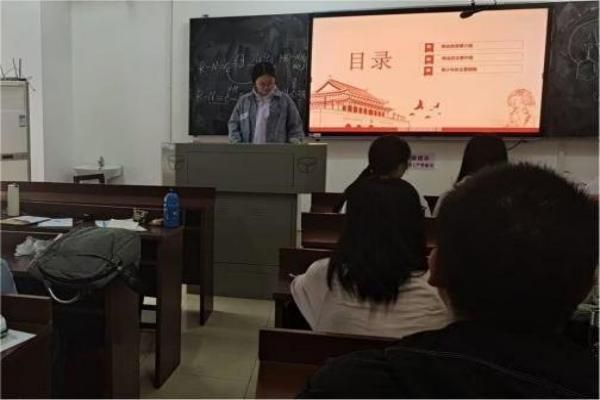 活动前期,由杨巧遇转发通知告知同学们活动开展的时间及地点,准备了活动需要的演示文稿。活动开始后,由杨巧遇介绍了此次活动的主题、背景、目的和主要内容。并且向同学们介绍了有关两会的详细内容,王欣和李彤两位同学在活动中发表了自己的看法。