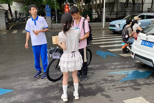 (通讯员 周诗忆)距离2023年全国高校招生水平考试还有16天,2023年5月21日下午两点半,,万象城awc8882102班青年志愿者委员周诗忆组织本班同学在万象城awc888附属中学校门口举办了“助力高考,未来可期”小组志愿活动。