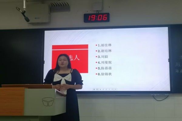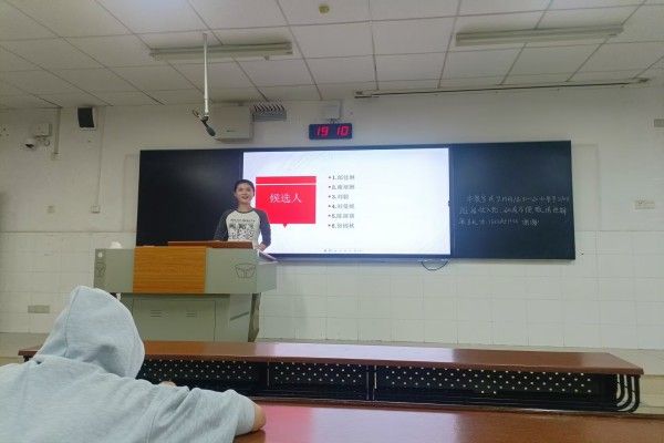 会议开始前,谢培琳提前发布消息,通知全体同学积极参加竞选并做好充足的准备。为了此次会议的顺利进行,谢培琳利用PPT展示名字的形式安排好了各竞选者的出场顺序。各竞选者依次发完言后,其余同学提问有关党的问题。随后,由全体同学通过投票的形式得出了最终的结果,六位候选人的票数从高到低依次是:刘曼妮、谢培琳、刘毅、邰佳琳、陈蓓蓓、徐锦秋。在刘曼妮向同学们通知完综合素质测评的有关事项后,大家有序离场。至此,此次会议结束。