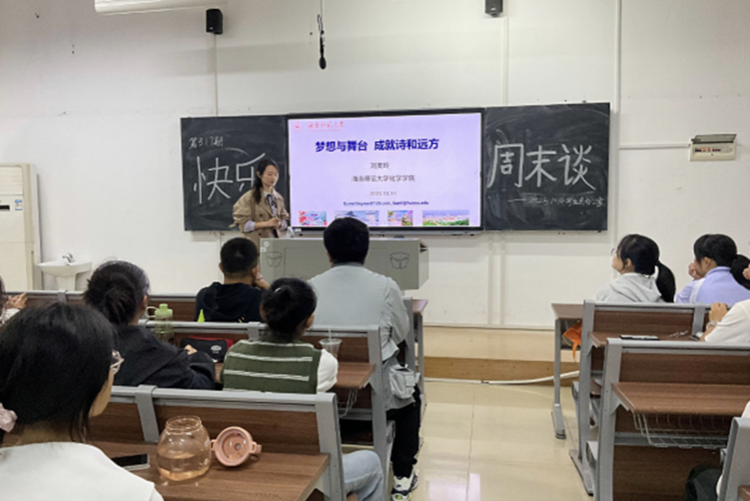 此次快乐周末谈以“梦想与舞台 成就诗和远方”为主题进行师生交流。活动伊始,刘美玲用自身经历作引,开始本次的快乐周末谈,以一个学者兼前辈的身份给予同学们忠告与建议。刘美玲化繁为简,条理清晰,将主题拆分为四个主题:梦想、大学、老师和自己。随后刘美玲又从个人际遇变化结合当下实际出发,脚踏实地、切实恳切地从多个方面让同学们了解了继续深造和步入社会的途径和利弊,为同学们科学性、系统性地介绍了化学相关专业的未来方向,传授了选择课题的经验。活动末期,刘美玲提供了自己学科组的相关资料,鼓励大家积极尝试,慎重考虑,合理抉择,找到自己人生的方向。