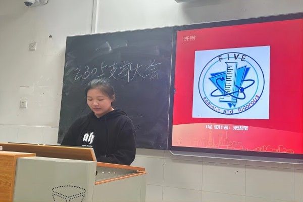 特色设计共由班徽、班服、班歌、班训和班级口号五部分组成。谢北通过图片展示了宋思莹和班长方磊设计的班徽以及班服款式颜色,通过文字展示了班歌候选曲以及班训班级口号优美语句。宋思莹和学习委员张旭上台分别介绍两枚班徽的设计理念,谢北详细介绍特色设计候选选项的背景,分析每首歌的寓意情感及每句班训班级口号的特色气概。支部成员在会议上展开热烈讨论,结合支部特色、专业特色和成员性格特点等因素进行多方考量,于会议尾声投票选出2305团支部的特色设计。谢北于会议后在通知群公示会议投票结果,与其余班委共同进行支部特色设计宣传,将特色设计用于支部文化建设。