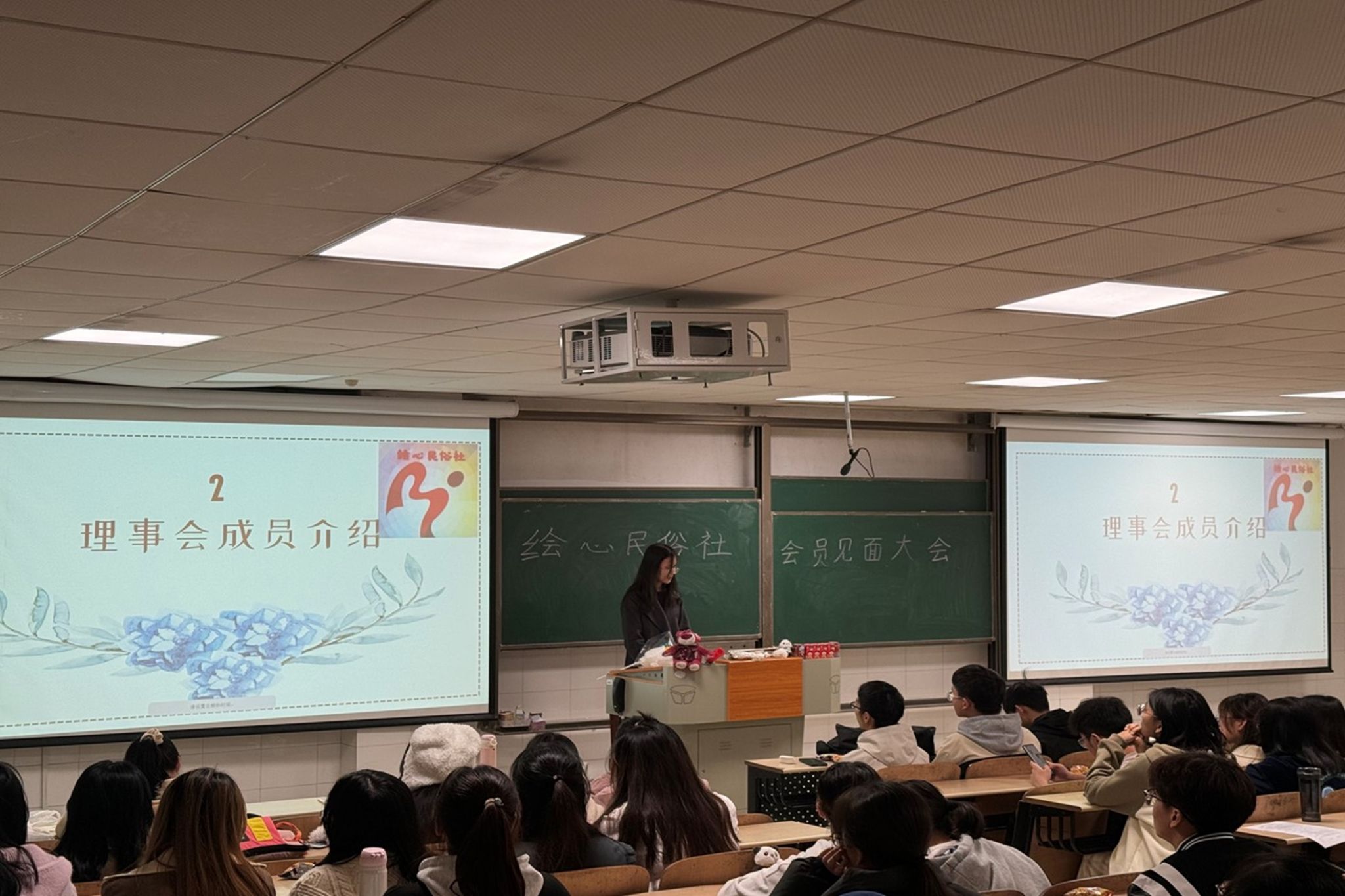 活动伊始,邱渝杰组织绘心民俗社全体理事会成员依次进行自我介绍。活动期间,为了激发会员的兴趣,绘心民俗社理事陈湘沅组织进行听歌猜歌名小游戏,并以小礼品作为奖励;绘心民俗社理事王燕组织进行击鼓传花真心话大冒险游戏,游戏新颖有趣,社团会员积极参与其中。小游戏结束后,邱渝杰宣布进行此次活动第三部分监事会成员选举,选举职务为监事长、副监事长、监事,各候选人依次上台演讲,由线上投票选举出最终监事会成员,监事长为唐一帆、副监事长为邓姣阳、监事为滑子曦、齐心悦、瞿淼。最后,邱渝杰宣布此次活动结束,会员们有序离场。