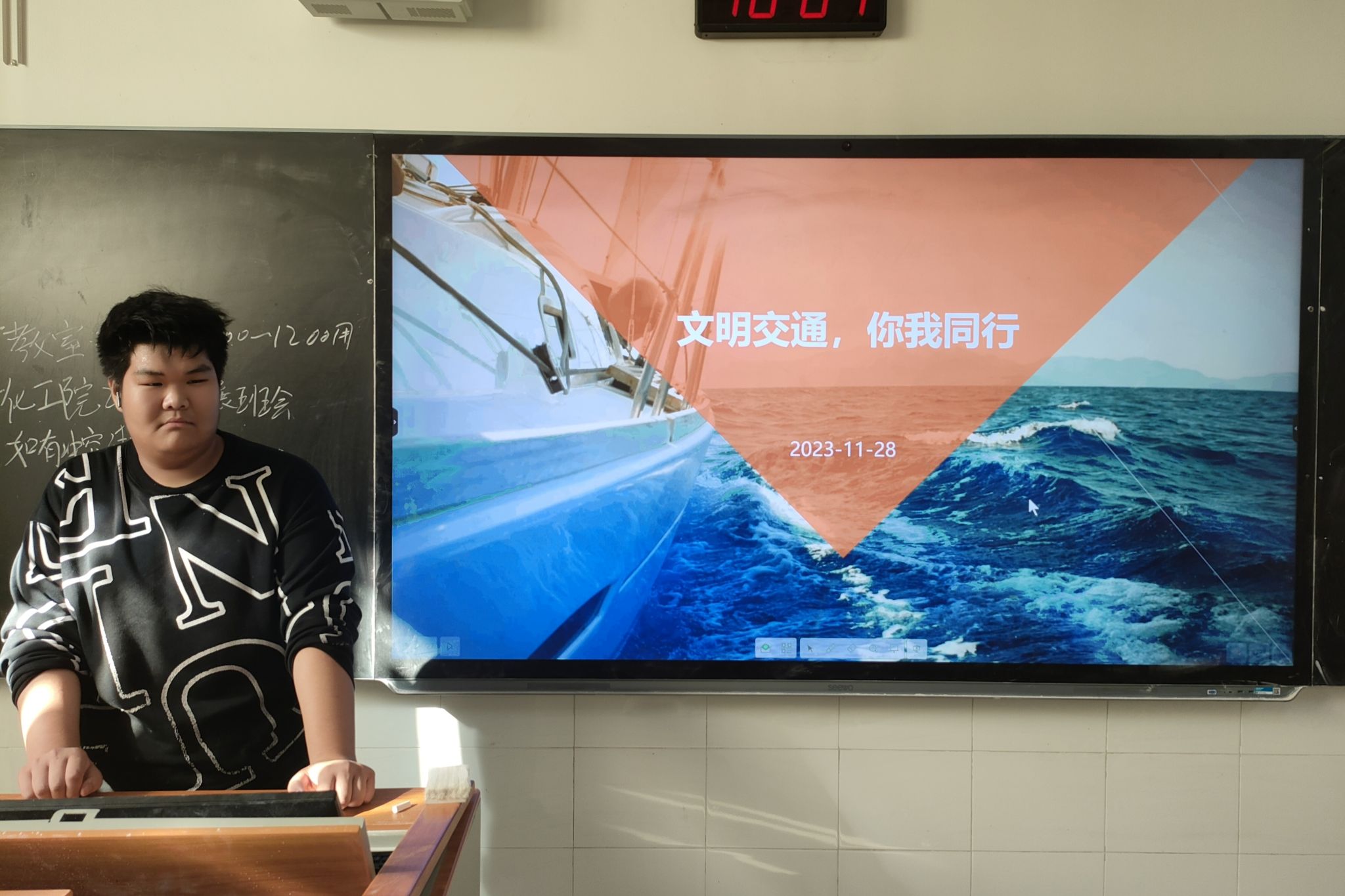此次活动开始前,张旭利用班级群对此次“文明交通,你我同行”主题班会进行宣传,并通知班级学生进行自主学习与讨论,为深入了解交通安全,此次活动分为了六个部分,文明交通概述,行人出行规范,非机动车出行规范,机动车出行规范,公交车乘坐规范以及交通安全的宣传和教育。在这几个环节中,张旭分别介绍了所需要遵守的规定并提醒同学们注意一些平时不会注意到的地方,在非机动车出行规范环节中,班长方磊阐述了自己上下学时得到的经验以及注意到的一些易犯错的点。在交通安全宣传教育环节中,张旭总结了本次会议的重点并呼吁同学们要注重交通教育的宣传。