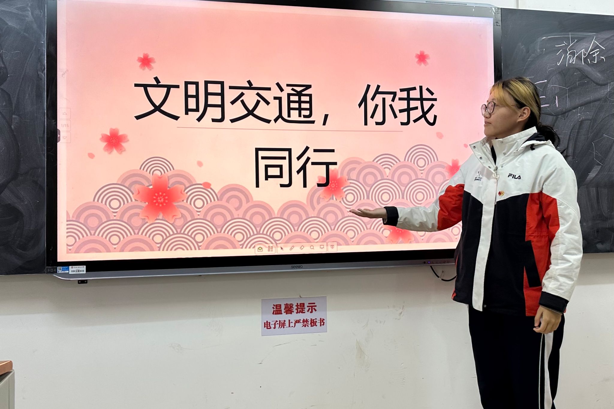 此次主题教育班会的内容分为什么是文明交通、文明交通的重要性和如何实践文明交通三个部分。班会开始时,由2207班学习委员房怡汐上台主持班会,为大家介绍文明交通的定义。房怡汐在班会第二部分的讲解中强调遵守交通规则、保证道路交通的有序进行的重要性,并通过播放交通安全宣传片的方式向同学们举例说明闯红灯、逆行、超速、超载等违法违规行为对社会出行环境造成的危害。班会结束时,房怡汐呼吁同学们遵守交通规则,共同营造良好的交通环境。