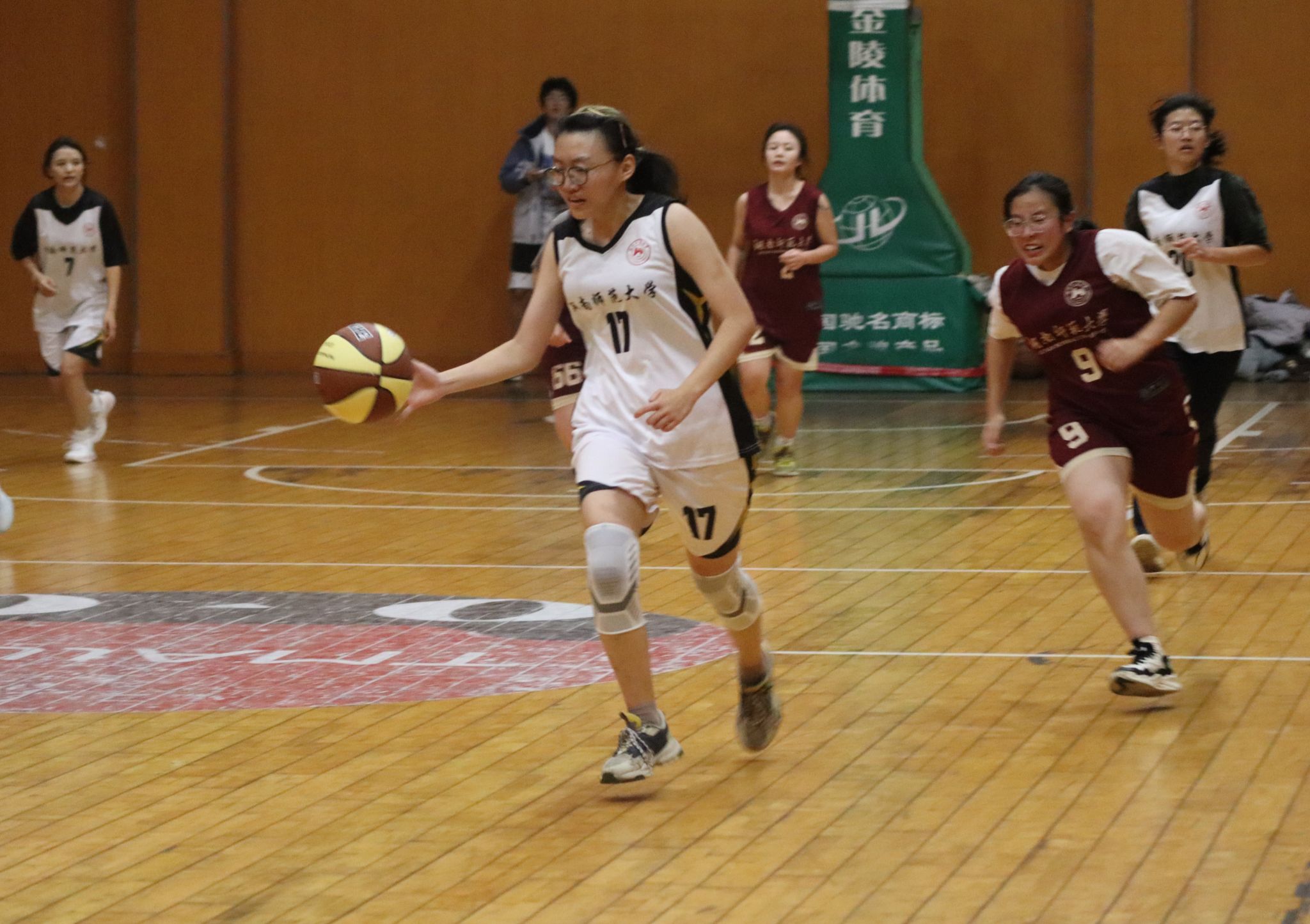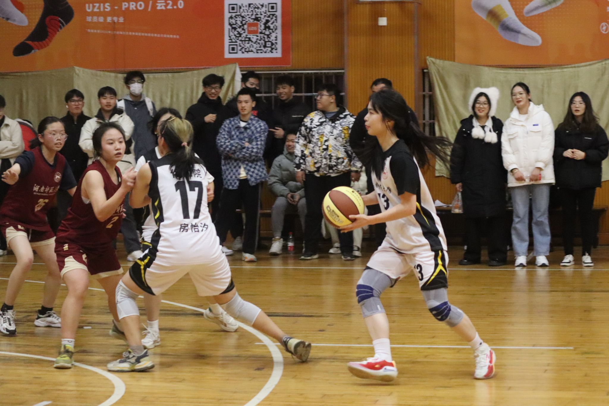 第三节比赛化工院比分暂时领先,达娃曲吉运球过半场放慢进攻速度,寻找空位队友组织进攻