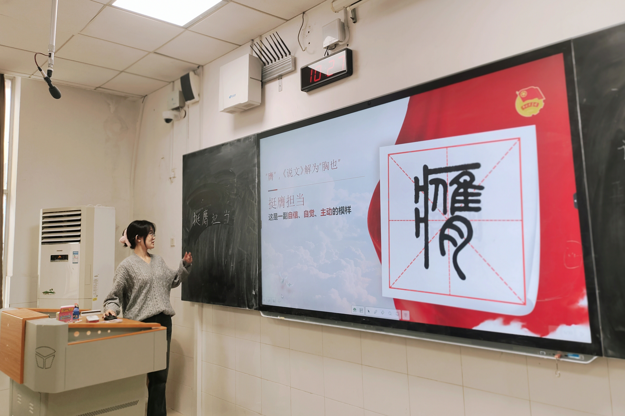 盖欣然由中国共产主义青年团成立100周年宣传片主题曲《有我》引出主题,围绕习近平总书记对广大青年提出的立志做有理想、敢担当、能吃苦、肯奋斗的新时代好青年和对广大团员提出的“五个模范、五个带头”的重要要求展开讲解学习,结合中国社会主义青年团成立之初到中国共产党成立100周年之间优秀青年榜样事例向同学们展现中国青年朝气蓬勃、勇于担当的精神品质。