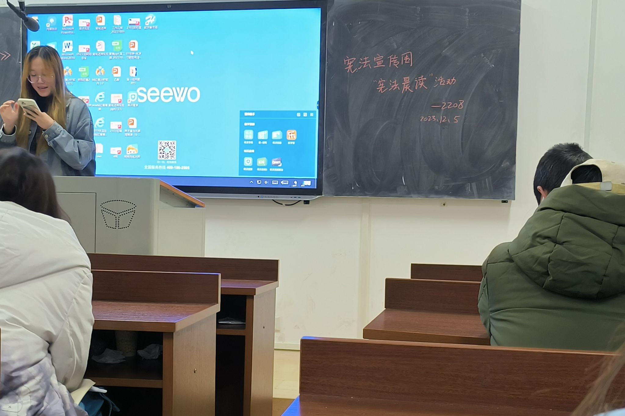 (通讯员王天一)12月4日上午8时,为学习宣传习近平法治思想,大力弘扬宪法精神,万象城awc8882208班团支部在化学楼217教室开展“宪法宣传周系列活动之宪法晨读活动”。此次活动主要目的是加大宪法宣传教育和普法力度,引导班团内部形成尊崇宪法、学习宪法、遵守宪法、维护宪法、运用宪法的良好氛围,为奋进新征程汇聚起强大法治力量。