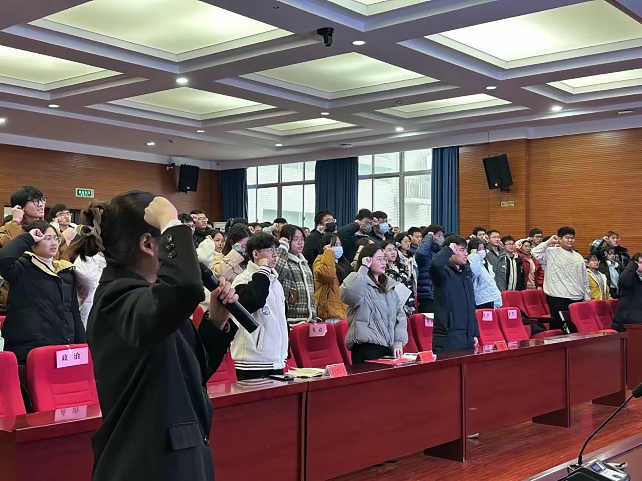 张婧致总结辞,表示三位主讲人对志愿精神的内涵认识较为全面,他们在志愿活动中帮助他人,温暖自己,他们的表现可圈可点。同时,她希望同学们牢记习近平总书记嘱托,“弘扬奉献、友爱、互助、进步的志愿精神,坚持与祖国同行、为人民奉献”,把志愿服务当成一种生活方式、生活习惯,把志愿精神当成一种工作态度、价值追求,创造更多人生出彩的机会。会议临近尾声,团委学生副书记黄铄婷带领大家宣读青年志愿者誓词。