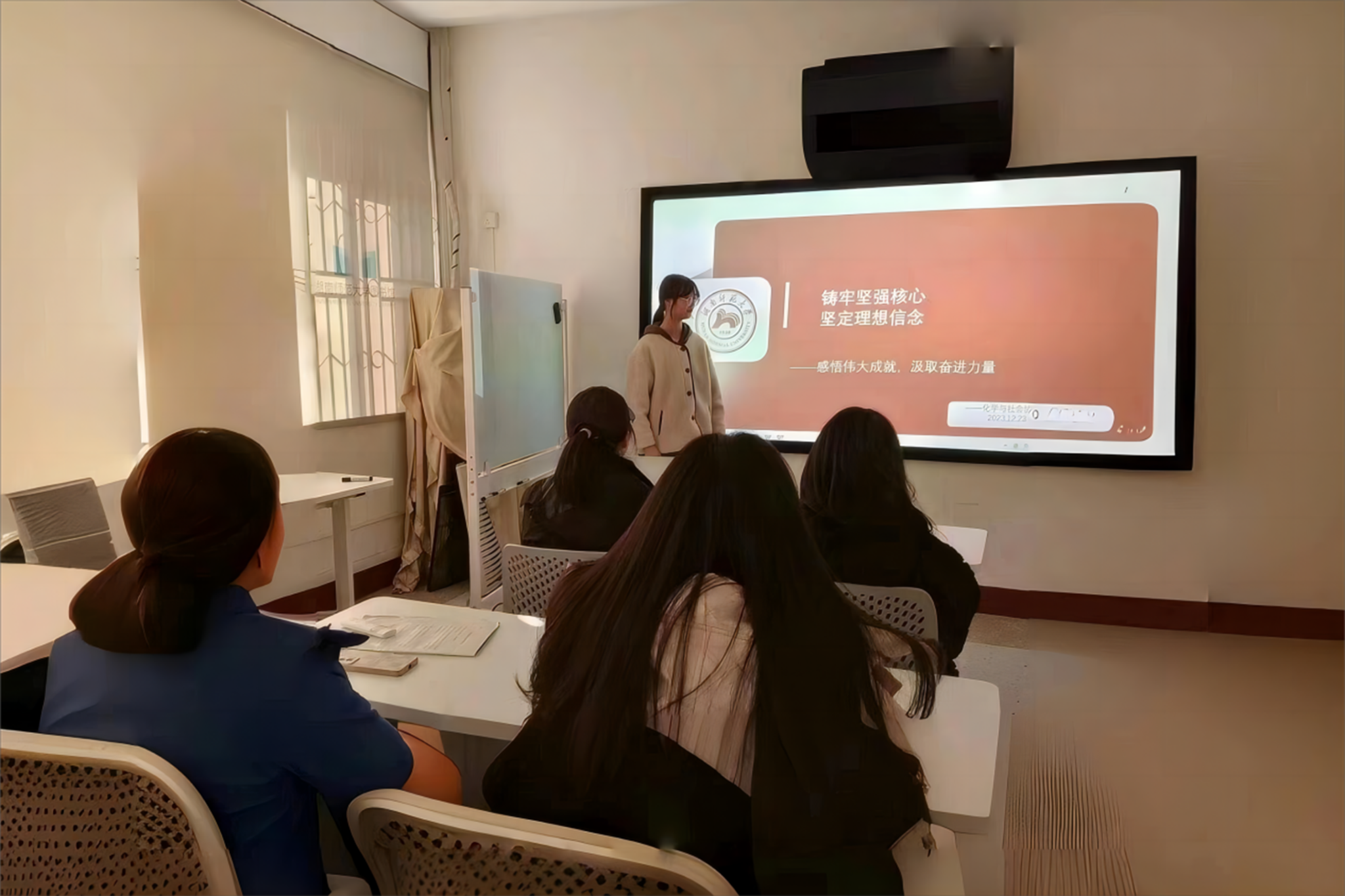 此次活动由理事肖艳准备PPT并讲解主题内容,活动提前一天在理事群里发送活动预告,确保理事们知道此次活动并按时参加。活动开始时,理事肖艳上台介绍主题,主要讲解加强理论修养、学习榜样力量、交流心得体会三个小标题。讲解完成后,随机选择一名理事分享主题感受。