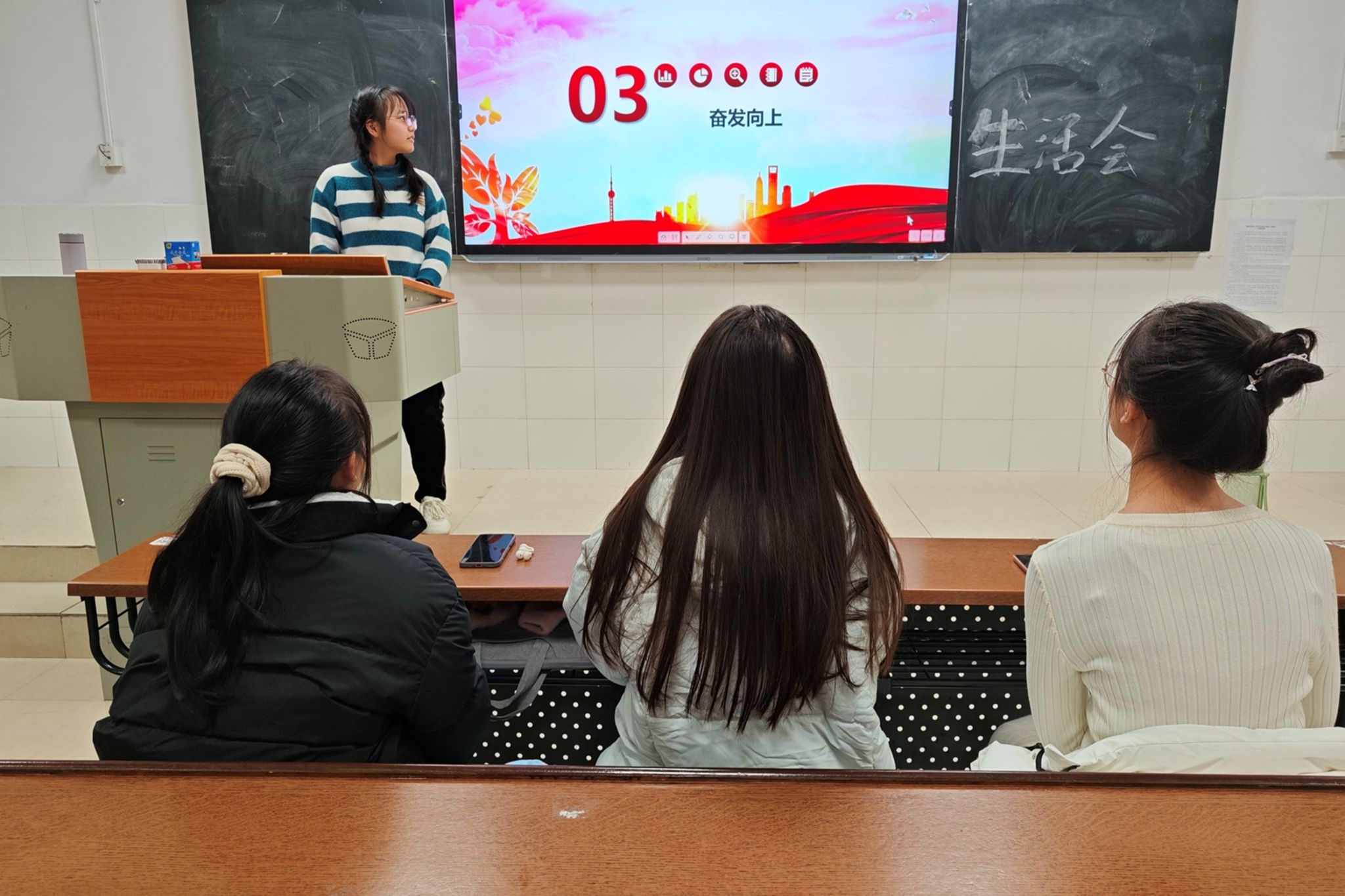 此次会议的主要内容共分为“明确纲领”,“敢于突破”,“奋发向上”,“强国精神”,“各方面成就”五个部分。会议伊始,曹雪倩等理事会成员依次上台阐述自己对“团支部专题组织生活会”的理解。每位理事通过PPT讲解或图片展示的形式,以“习近平新时代中国特色社会主义思想”为着力点,结合之前举办的团日主题会议和个人实际来叙述“习近平新时代中国特色社会主义思想”的重要性和先进性。会议最后,理事会成员们各自分享此次会议的心得体会,并分析本学期思想道德和学习工作方面的不足,确定今后努力方向。王燕再进行整理点评并宣布会议结束。