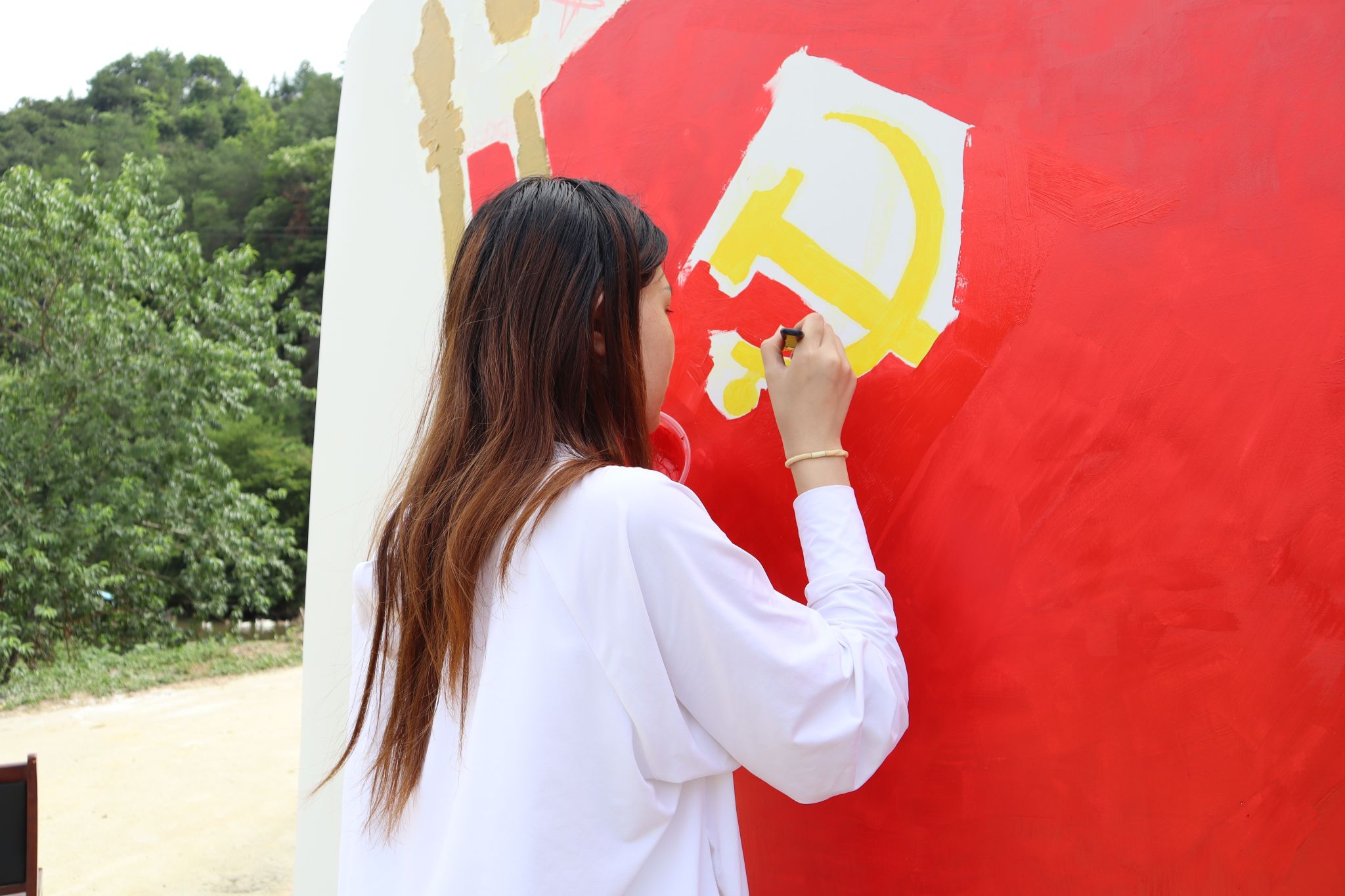 实践团成员为了结合当地特色文化背景,实地走访调研了乡村文化环境,对不同大小、不同位置、不同材质的墙面进行观察测量,并确立以弘扬社会主义核心价值观为主题进行构图创作。成员们发挥自身专业特长,在政府工作人员的指导和帮助下,通过墙绘把农村人居环境整治与精神文明建设有效结合,引导村民们树新风、倡新风,提高村民的幸福感和获得感。