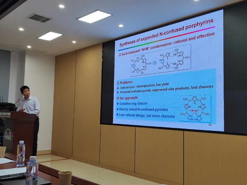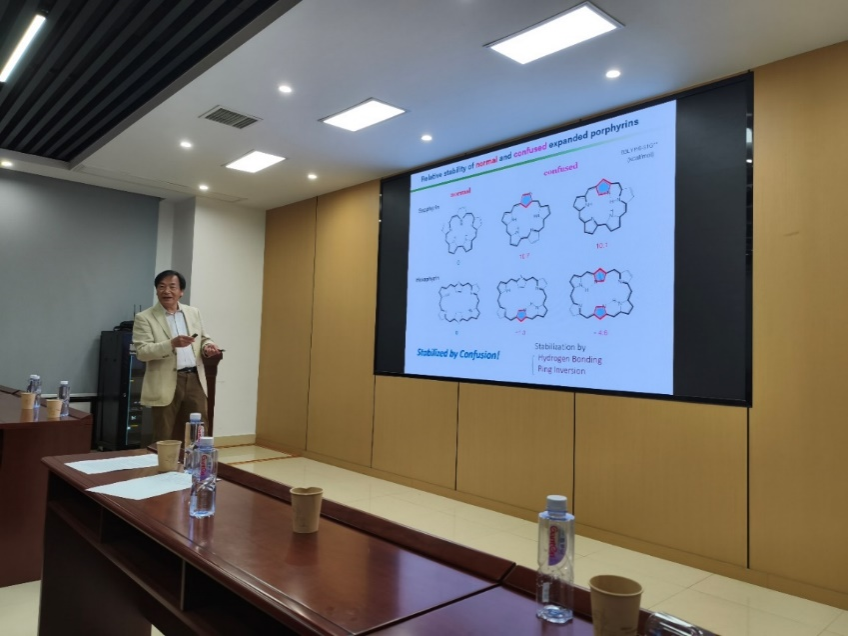 Furuta教授的报告题目为《N-confusedporphyrinoids: Directional evolution from porphyrin isomer to functional NIR dyes》,首先,Furuta教授详细地解释了氮错位卟啉(N-confusedporphyrinoids)的种类与结构,氮错位卟啉是卟啉的同分异构体,分子中有一个或多个N原子朝向环外,环内为sp2的碳氢,这一细微变化,使得氮错位卟啉的性能与应用发生了很大变化。结构修饰的N-错位卟啉在近红外区吸收有显著的提高,这为生物成像,光动力治疗提供了研究基础。讲座完成后,现场师生踊跃提问,与Furuta教授就化学反应本质和潜在的反应机理进行了热烈讨论。教授细心解答了师生们的所提出的疑问,并总结了N错位卟啉的研究前景和重要意义。