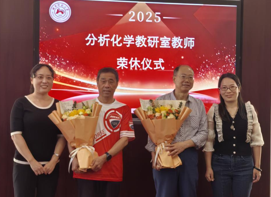 活动现场,一场洋溢着温情与庄重的退休教师致敬仪式尤为吸睛。化学系教工党支部精心为分析化学教研室的方正法、李添宝两位退休教师举办荣休仪式。会上,教师与学生代表们纷纷发言,深情回忆两位教师数十载的育人点滴,倾诉感恩之情。年轻教师代表更是奉上鲜花与纪念品,致以崇高敬意。两位退休教师也分享从教心得,寄语青年教师传承学院“树人化物,创新致用” 传统,精雕细琢每一堂课,让讲台化作知识与理想的播撒之地。