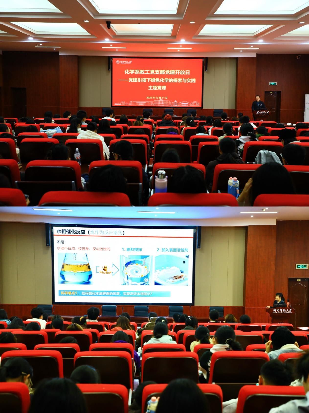 在主题党课环节,支部党员、副院长谭蓉教授以“党建引领下绿色化学的探索与实践——水中的有机反应”为题,系统讲解了绿色化学理念在科研中的实践,并结合前沿成果展示了其在生活中的应用,体现了党建工作对科研创新的引领作用。