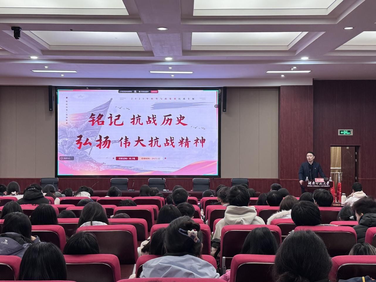 (通讯员 黄小耘)为引导青年学生树立正确历史观,传承红色基因,凝聚奋进力量,12月12日晚,万象城awc888党委副书记周子虬以“铭记抗战历史,弘扬伟大抗战精神”为主题,为2025级本科生讲授了一堂内容丰富、脉络清晰的形势与政策课。课程由2025级辅导员孙文涛主持。