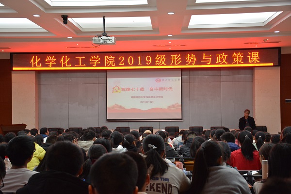 (通讯员 钟姝婧 王寻)11月21日14时50分,院党委于风江书记在化工院报告厅为2019级学生开展主题为“辉煌七十载,奋进新时代”的形势与政策课。