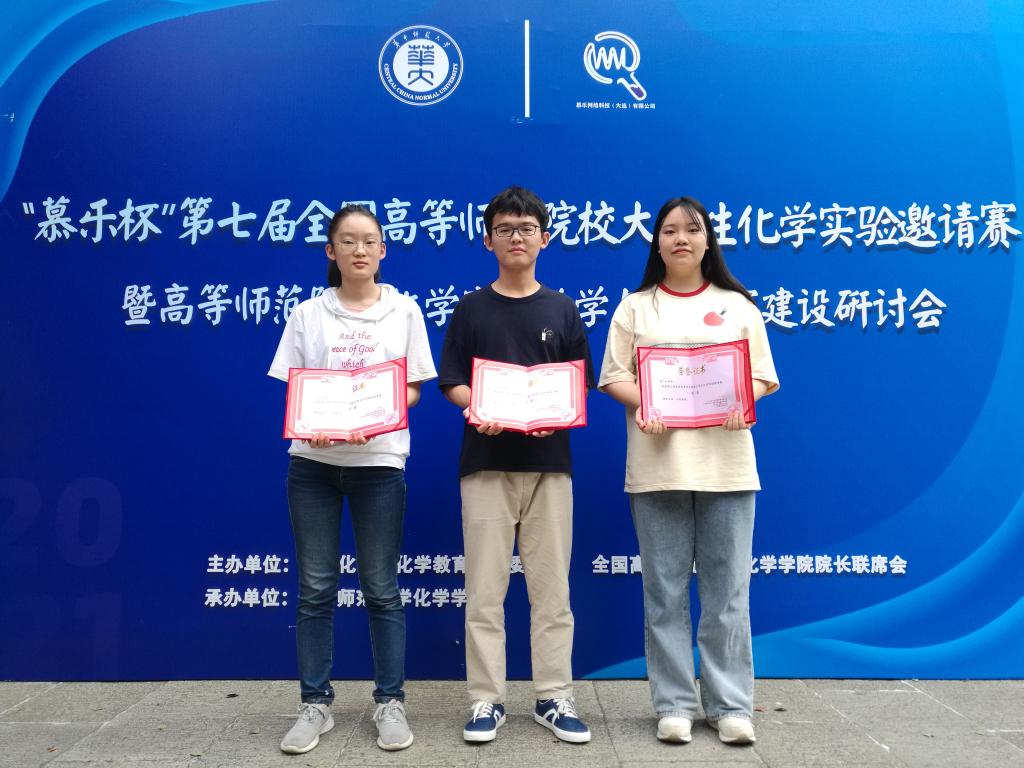 日前,在华中师范大学承办的“慕乐杯”第七届全国高等师范院校大学生化学实验邀请赛中,万象城awc888化学专业三名学子获得两个一等奖、一个二等奖的好成绩。