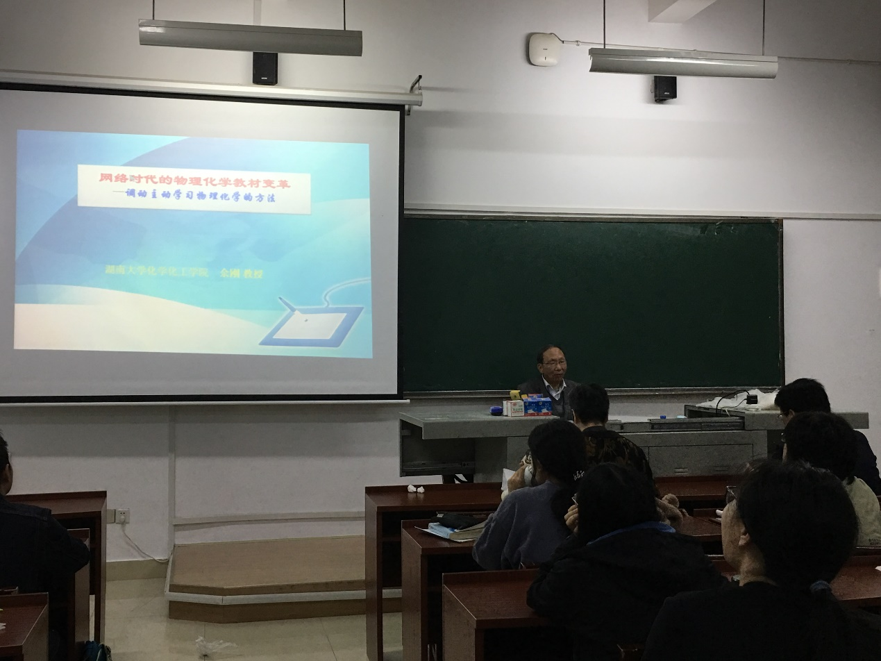 (通讯员:黄炜)为进一步加强物理化学及实验课程的教学能力和教材建设能力,10月13日下午,我院物理化学教研室邀请《精编物理化学讲义》主编、湖南大学前物理化学学科带头人余刚教授在学院117/118教室做了题为“网络时代的物理化学教材变革——调动主动学习物理化学的方法”的教学报告。报告会由我院物理化学学科带头人南延青主持。