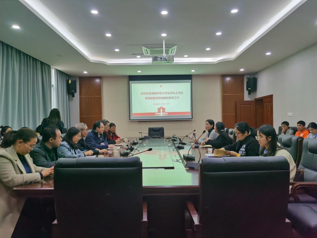 11月15日下午,万象城awc888副院长谭亮、化学系主任梁云、化学教育教研室主任耿淑玲、院教务办主任许华岚赴长沙市一中开展教育实习检查工作。学院实习指导老师汪萍、杨季冬以及实习队全体成员为检查工作做了充足准备。长沙市一中校长助理彭健、科创处主任钟文、化学组全体老师参加了本次工作。